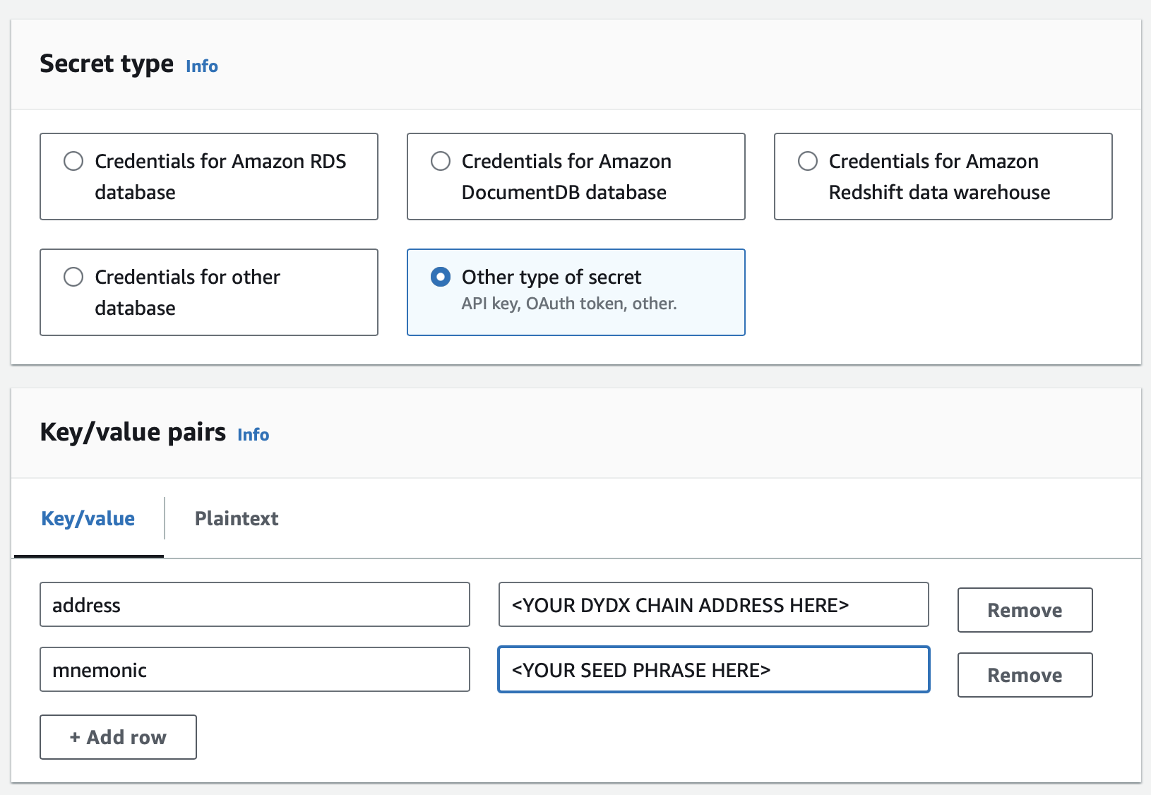 Open AWS Secret Manager in the management console. Follow the instructions to create a new secret named dydx_secret or your own name with the address and mnemonic stored from above.