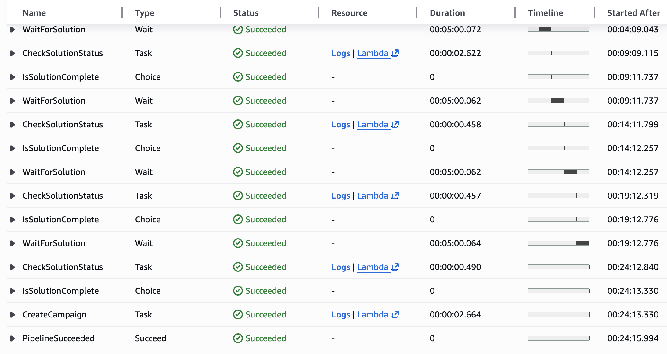 Hands-On Practice: Amazon Personalize - Part IIIMonitoring State Machine ExecutionOn this pageMonitoring State Machine Execution Workflow running status Wait for Solution State View Pipeline Succeeded