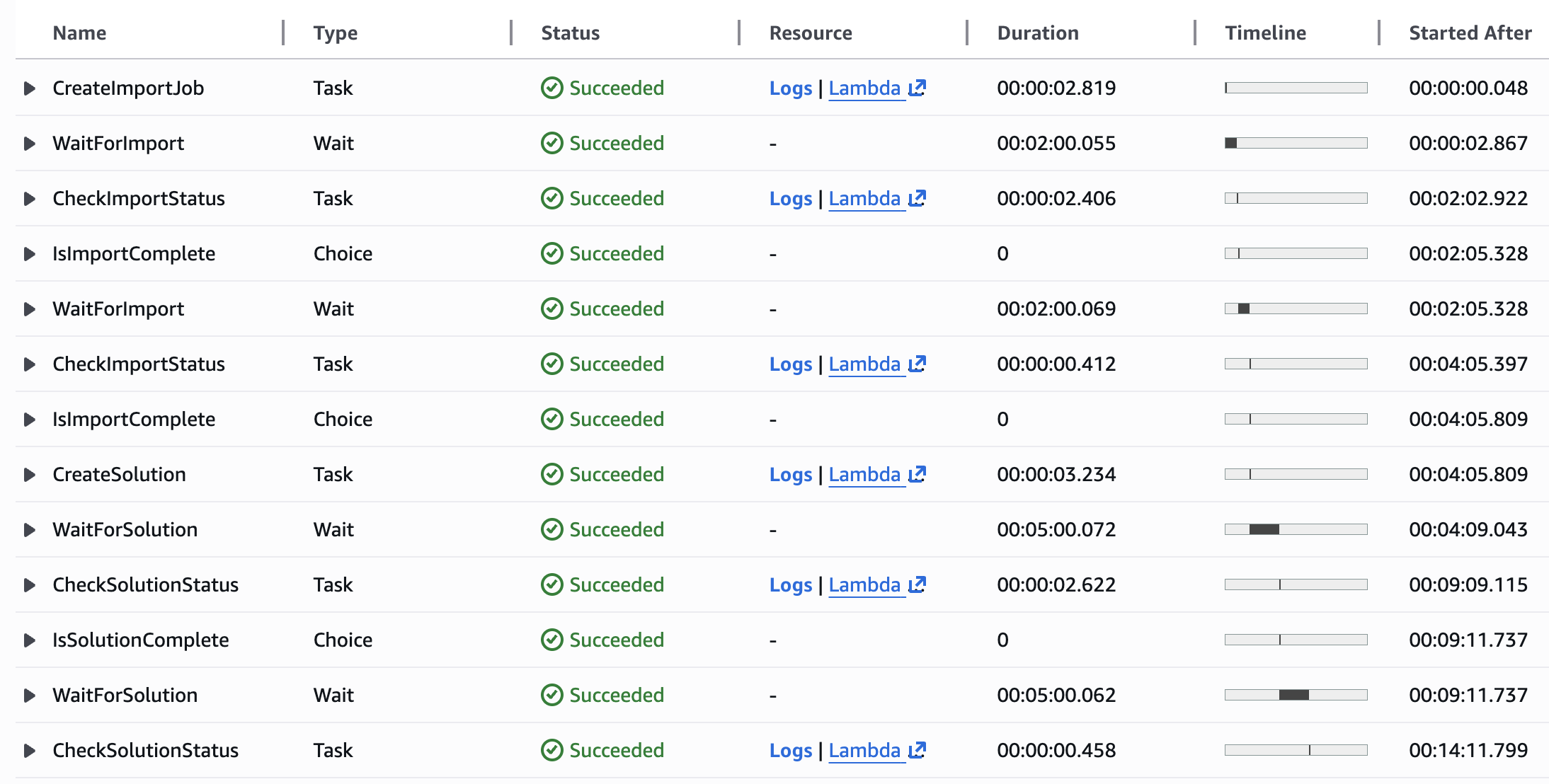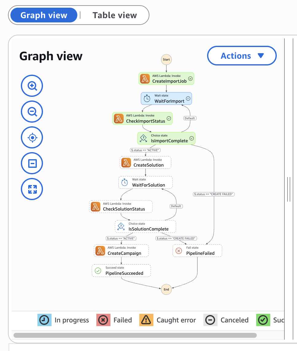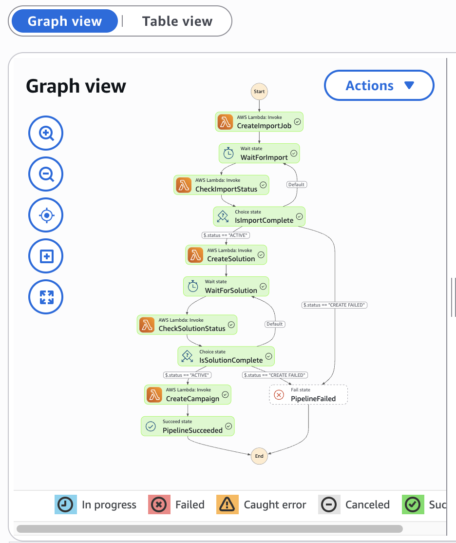 Hands-On Practice: Amazon Personalize - Part IIIMonitoring State Machine ExecutionTrên trang nàyMonitoring State Machine Execution Workflow running status Wait for Solution State View Pipeline Succeeded